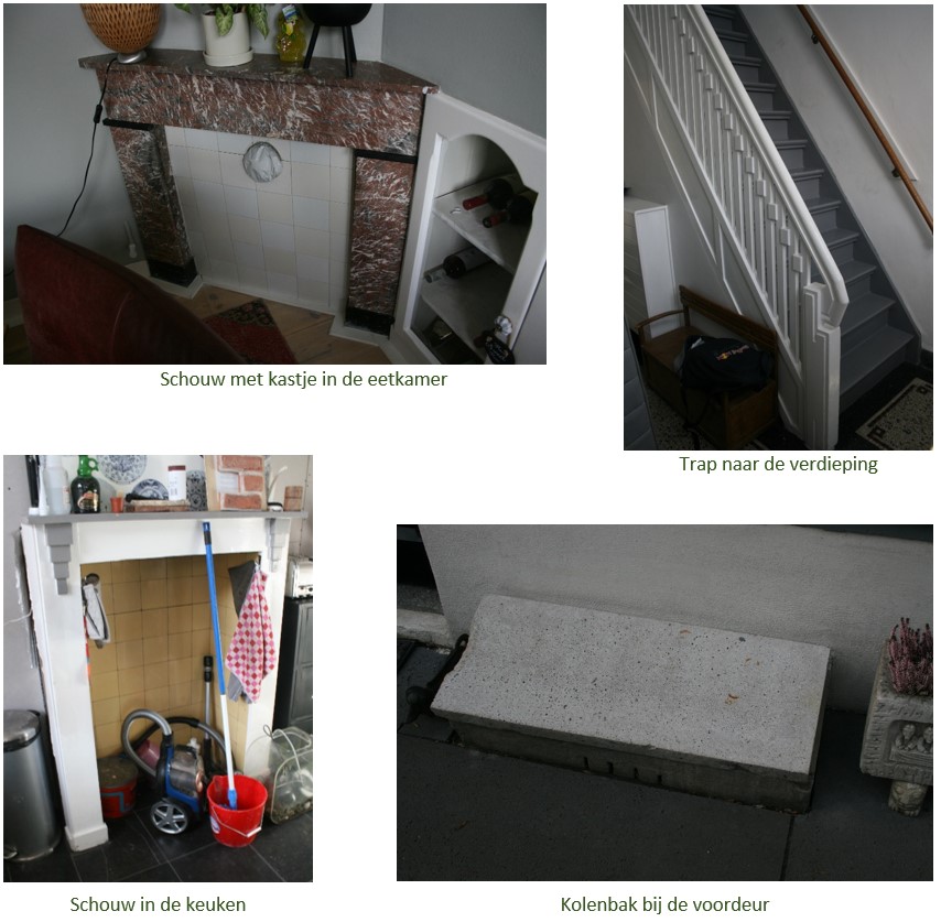 Het interieur van het pand bezit nog een aantal bijzondere elementen die goed bewaard zijn gebleven. De schoorsteenmantel van de schouw in de eetkamer, en de ensuite deuren en de kasten tussen de eetkamer en de woonkamer zijn zeer waarschijnlijk nog oorspronkelijk. De schoorsteenmantel van de schouw in de keuken, de terrazzovloer in de gang, de trap naar de verdieping met traphek en de meeste binnendeuren zijn waarschijnlijk aangebracht tijdens de renovatie van 1914. De trap en de haard in de keuken zijn uitgevoerd in een vroege art-decostijl. Een bijzonder detail is de kolenbak bij de voordeur. Via een sleuf kwamen de kolen vanuit deze bak uit in een bak in het keldertje onder het huis.