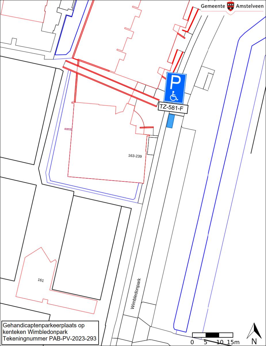 Burgemeester en wethouders van Amstelveen besluiten het parkeren te verbieden op een parkeerplaats in de straat Wimbledonpark, zoals aangegeven op tekening PAB-PV-2023-293, met uitzondering van het voertuig met het kenteken TZ-581-F (gehandicaptenparkeerplaats).