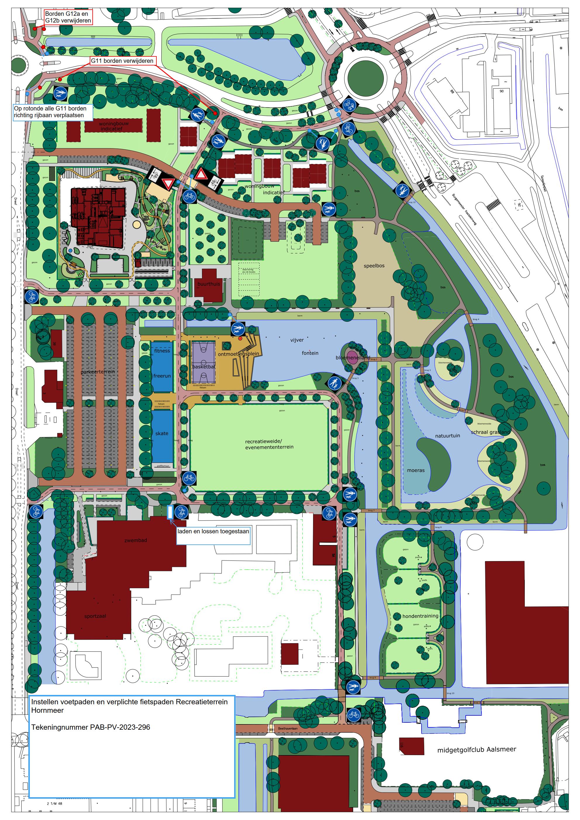 Burgemeester en wethouders van Aalsmeer besluiten tot het instellen van voetpaden en verplichte fietspaden op het opnieuw ingerichte Recreatieterrein Hornmeer. Het gebied wordt begrensd door de Burgemeester Kasteleinweg, Zwarteweg, Dreef en Beethovenlaan, zoals aangegeven op tekening PAB-PV-2023-296.