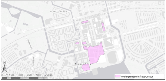 In het plangebied zijn meerdere ondergrondse infrastructuren aanwezig (ondergrondse parkeergarages, kelders en wegen). Bij de inpassing van de bronnen en de kabels en leidingen op eigen en openbaar terrein (alleen bij toestemming van de gemeente) dient rekening gehouden te worden met deze bestaande ondergrondse infrastructuren. In Figuur 3.4 is een overzicht van de bekende ondergrondse infrastructuren weergegeven.
