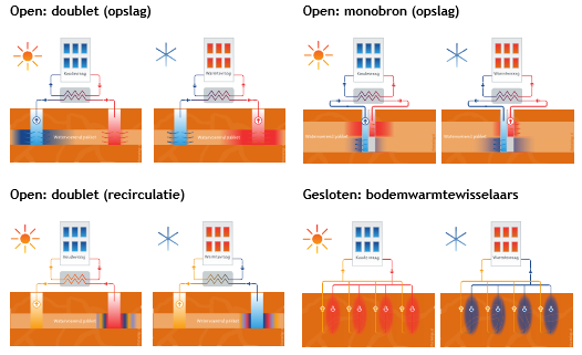 Bodemenergiesystemen maken gebruik van de bodem om warmte en/of koude op te slaan in het aanwezig grondwater. Deze warmte en/of koude wordt gebruikt voor de klimatisering van gebouwen of processen. Hiermee worden aanzienlijke energiebesparingen ten opzichte van conventionele verwarmings- en koelinstallaties gerealiseerd. Onderstaand figuur presenteert de verschillende typen bodemenergiesystemen.