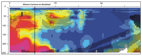 Figuur 3.3 | 3D-matrix van chloridegehaltes in Flevoland (Zoet-zout studie Provincie Flevoland, TNO en Deltares). Oost-west-georiënteerde dwarsdoorsnede door Flevoland, donkerblauw = zoet, donkerrood = zout.