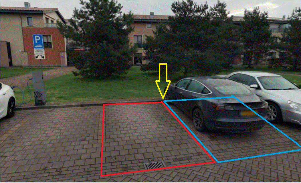 Blauwe markering= Besluit punt 2: In de toekomst mogelijk te realiseren extra parkeervak voor opladen elektrische voertuigen. Geel=aangewezen locatie voor oplaadpaal en bord E4 of E8 met onderborden)