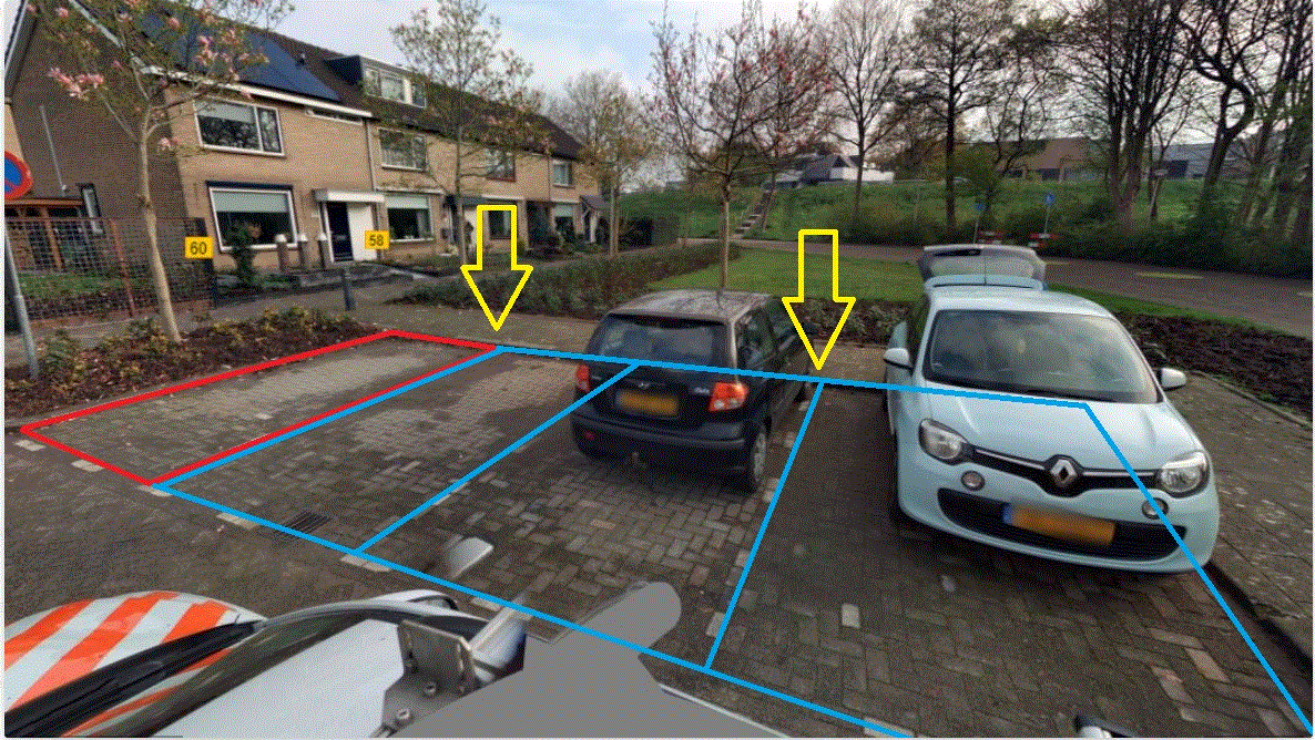 Blauwe markering= Besluit punt 2: In de toekomst mogelijk te realiseren extra parkeervakken voor opladen elektrische voertuigen. Geel=aangewezen locatie voor oplaadpaal en bord E4 of E8 met onderborden)