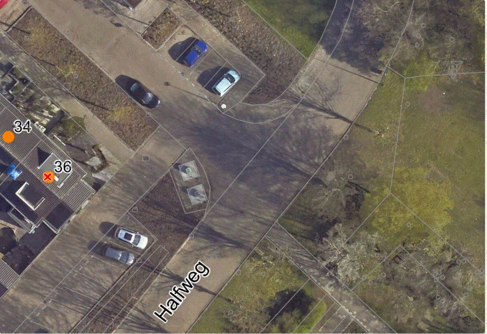Luchtfoto met locatie parkeergelegenheid voor het opladen van elektrische voertuigen aan de Kruiswiel.