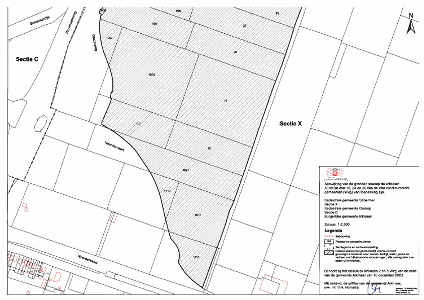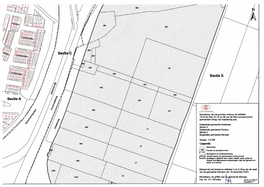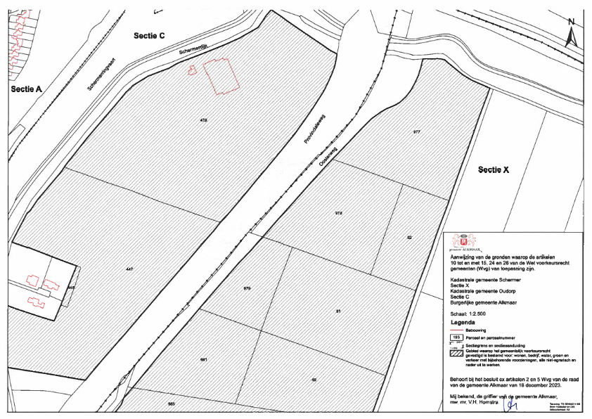 Lijst van aangewezen percelen in de kadastrale gemeenten Oudorp (sectie C) en Schermer (sectie X) te gemeente Alkmaar, waarop de artikelen 10 tot en met 15, 24 en 26 van de Wet voorkeursrecht gemeenten (Wvg) van toepassing zijn, zoals deze voorkomen op de kadastrale tekeningen met nummers TK-30405074-05, TK-30405074-06, TK-30405074-07 en TK-30405074-08, behorende bij het besluit van de raad van de gemeente Alkmaar ex artikelen 2 en 5 Wvg van 18 december 2023.