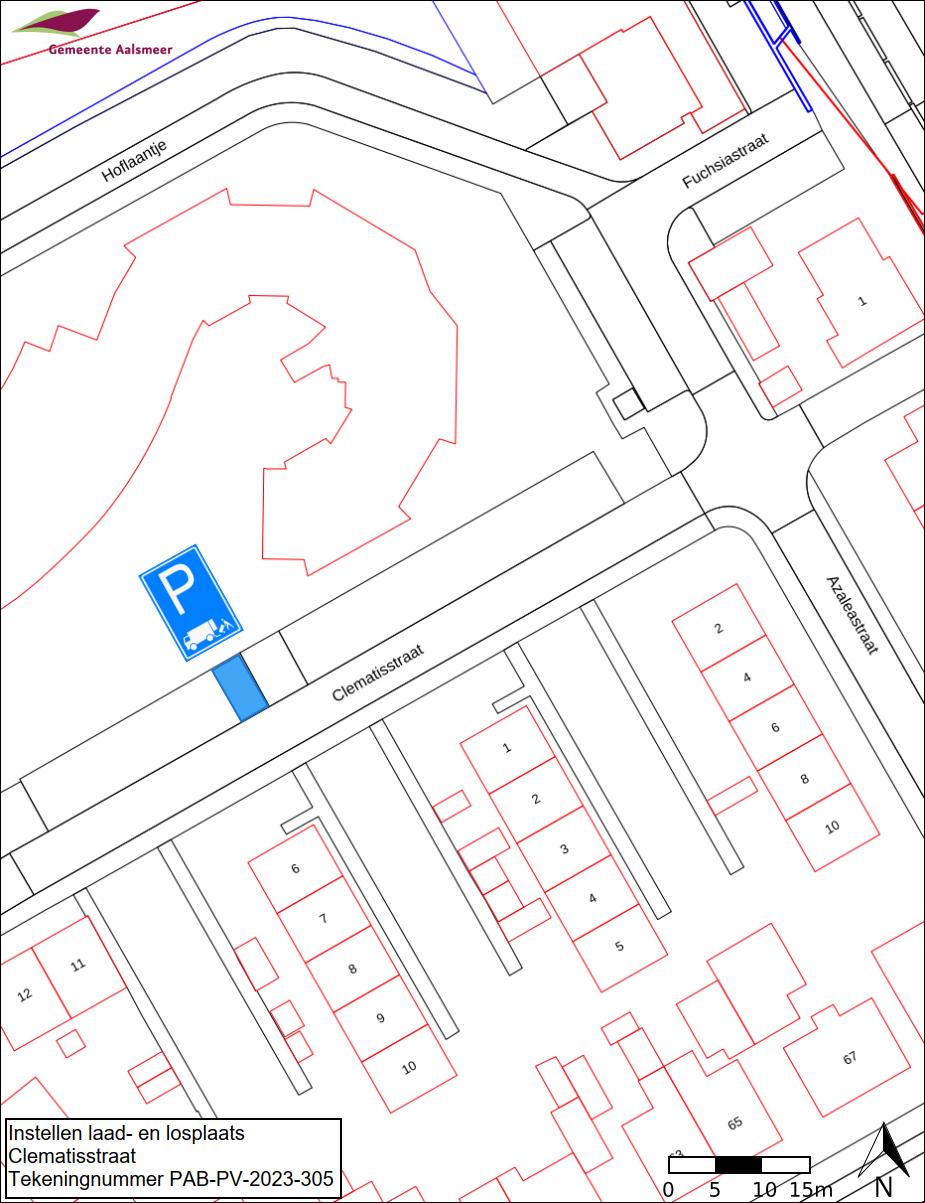 Burgemeester en wethouders van Aalsmeer besluiten om een gelegenheid bestemd voor het onmiddellijk laden en lossen aan te wijzen in de Clematisstraat, ten zuidwesten van de bovengrondse containers.