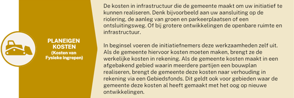 Ook geeft de gemeente aan welke kosten zij maakt voor de realisatie van uw initiatief. Deze kosten brengt de gemeente bij u, als initiatiefnemer, in rekening. Dit wordt kostenverhaal genoemd. Voor dit kostenverhaal vraagt de gemeente een zogenaamde ‘exploitatiebijdrage’.