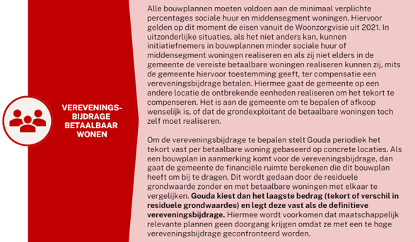 Berekening tekort per betaalbare woning: Gouda stelt de komende periode het tekort vast op basis van concrete projecten met extra betaalbare woningen ten opzichte van de minimale doelen in het woonbeleid. Hier zal onderscheid worden gemaakt naar woningbouwcategorie (sociale of middensegment) en exploitatievorm (huur of koop). De resulterende bedragen worden dan de maximale vereveningsbijdragen per woningbouwcategorie en exploitatievorm.