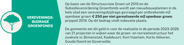Doelbestemming van de te storten bijdragen: Het doel van de bijdrage is het versterken van de gemeentelijke groen- en recreatiestructuur (dit is de gewenste ontwikkeling waarvoor de bijdrage wordt gevraagd); dit doel wordt bereikt door een bijdrage te vragen t.b.v. de compensatie van ontbrekend openbaar groen in plannen waar dit groen voor welke reden dan ook niet haalbaar is (dit zijn de maatregelen waarmee de gewenste ontwikkeling wordt gerealiseerd). De middelen worden ingezet bij voorrang in die wijken waar de groen- en recreatiestructuur het zwakste is: Binnenstad, Kadebuurt, Kort Haarlem, Korte Akkeren, Gouda Noord en Goverwelle. Voor de periode 2023-2026 is dit vertaald in 21 concrete projecten in deze wijken.