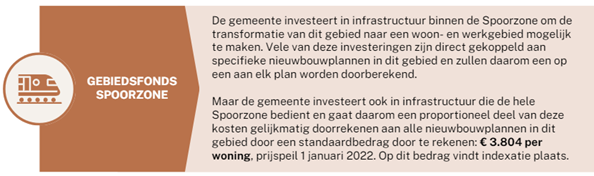 Dit Gebiedsfonds Spoorzone gaat over de onder (2) genoemde investeringen. Ze zijn van dienst voor de gehele Spoorzone en worden daarom aan alle nieuwbouwplannen daarin gelijkmatig doorberekend. Hier wordt rekening gehouden met de mate van profijt dat de nieuwbouwplannen in de Spoorzone hebben ten opzichte van de bestaande gebouwen in de Spoorzone en ten opzichte van andere delen van Gouda buiten de Spoorzone. Op basis hiervan wordt in totaal ca € 9,5 miljoen toegerekend aan de nieuwbouwplannen, wat neerkomt op een bijdrage van € 3.804 per woning. Dit bedrag is prijspeil 1 januari 2022. De bedragen worden geïndexeerd met het GWW-indexcijfer van het CBS tot de maand van betaling.
