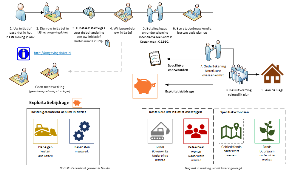 Indien een initiatief niet binnen een bestemmingsplan past, beoordeelt de gemeente het initiatief. De gemeente kan onder voorwaarden meewerken aan een nieuw ruimtelijk kader voor uw initiatief. Hierbij kijkt de gemeente of en hoe uw plan bijdraagt aan de ambities voor de gemeente Gouda. Zo heeft de gemeente onder andere beleid voor betaalbaar wonen, groen, parkeren en deelmobiliteit. Verder is een belangrijke voorwaarde dat goed geregeld is dat de kosten die de gemeente maakt voor uw initiatief betaald worden door degene die het initiatief indient. De gemeente is verplicht deze kosten op de initiatiefnemer te verhalen. Vandaar de term kostenverhaal. Hoe dat in zijn werk gaat en welke kosten u moet betalen kunt u lezen in deze nota.