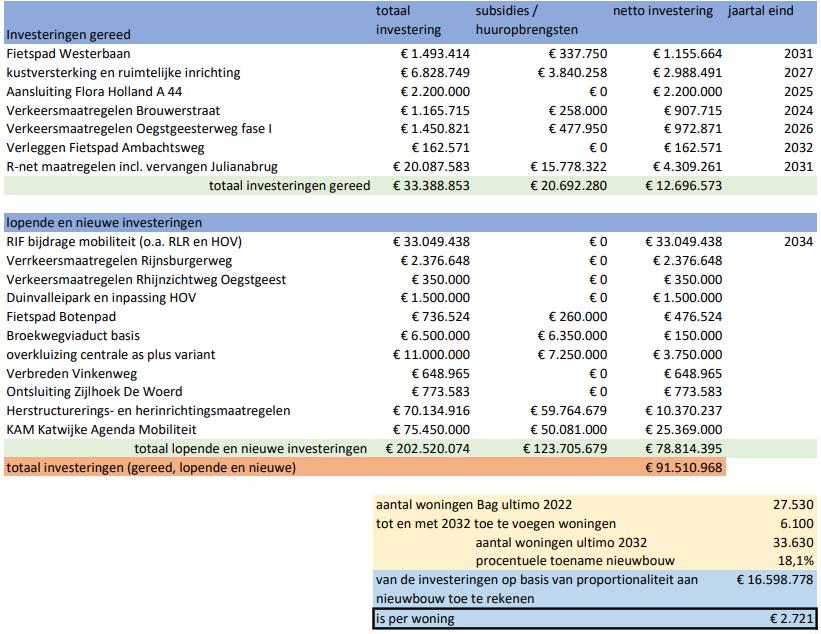Katwijk heeft per medio 2024 ongeveer 27.530 woningen. Op basis van de woonagenda worden hier tot en met 2033 ± 6.100 woningen aan toegevoegd waarmee de woningvoorraad dan ± 33.630 zal zijn. Het aandeel nieuwbouwwoningen hierin is dan afgerond 18%. Dat houdt in dat op basis van het proportionaliteitscriterium 18% van de investeringen met het label bovenwijkse voorzieningen is toe te rekenen aan de nieuwe bebouwing.