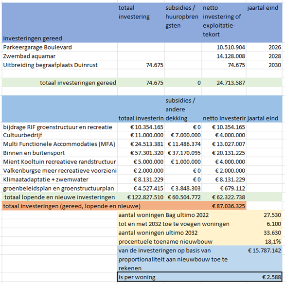 In de tabel van bijlage 4 zijn de investeringen opgenomen die voldoen aan de criteria voor een vrijwillige financiële bijdrage. Met toepassing van het proportionaliteits-percentage volgt hier uit dan het tarief voor de vrijwillige financiële bijdrage per te bouwen woning(equivalent).
