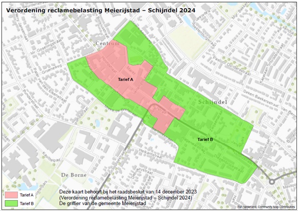 Deze kaart behoort bij het raadsbesluit van 14 december 2023 (Verordening reclamebelasting Meierijstad / Schijndel 2024)