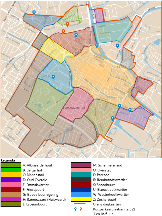 Gebied dat begrensd wordt door Jan van Scorelkade, Hoevervaart (tussen Jan van Scorelkade en Lisdoddestraat, Lisdoddestraat, denkbeeldige lijn Lisdoddestraat-Bannewaard, Bannewaard, spoorbaan (tussen Bannewaard en Rekerdijk), Rekerdijk (tussen spoorbaan en Hoornsevaart, Hoornsevaart (tussen Frieseweg en Friesepoort), Friesepoort, De Friese Poort, Frieseweg tussen Friese poort en Lepelaarstraat), Ooievaarstraat (tussen Frieseweg en Burg. G. Bosstraat), Frieseweg (tussen Ooievaarstraat en Randersdijk), Randersdijk (tussen Frieseweg en Burg. G. Bosstraat), Burg G. Bosstraat (tussen Kievitstraat en Noord-Hollandskanaal) en Noord-Hollandskanaal (tussen Burg. G. Bosstraat en Oudorperdijkje), Oudorperdijkje (tussen Noord-Hollandskanaal en prinses Amaliaplantsoen, prinses Amaliaplantsoen, water (tussen prinses Amaliaplantsoen en Noord-Hollandskanaal, Noord Hollandskanaal (tussen ’t Hondsbosch en Tweede Kanaalstraat), Eerste Kanaalstraat, Cornelis Evertsenstraat, Coornhertkade , Rederijkershof, as van de Vondelstraat (tussen Rederijkershof en Cort van de Lindenkade), Cort van der Lindenkade (tussen Vondelstraat en van Hogendorpstraat), Singel (tussen Cort van der Lindenkade en Mauritskade), Heilooerdijk (tussen Mauritskade en Kennemerstraatweg), as van de Kennemerstraatweg (tussen Heilooerdijk en Nieuwpoortssteeg, Nieuwpoortssteeg, Nieuwpoortslaan, Regulierslaan (tussen Nieuwpoortslaan en Zanderssloot), Zanderssloot tussen Regulierslaan en Beatrixlaan, Beatrixlaan, Overkrocht, Spoorbaan (tussen Overkrocht en Steesloot), Steesloot (tussen Spoorbaan en Hoevervaart), Hoevervaart (tussen Steesloot en Bergerweg), Bergerweg (tussen Hoevervaart en Oude Hoeverweg), Oude Hoeverweg (tussen Bergerweg en Jan van Scorelkade), inclusief genoemde straten en straatdelen.