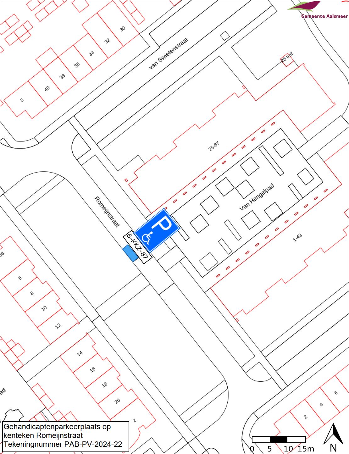Burgemeester en wethouders van Aalsmeer besluiten het parkeren te verbieden op een parkeerplaats in de Romeijnstraat, zoals aangegeven op tekening PAB-PV-2024-22, met uitzondering van het voertuig met het kenteken 6-KKZ-87 (gehandicaptenparkeerplaats).