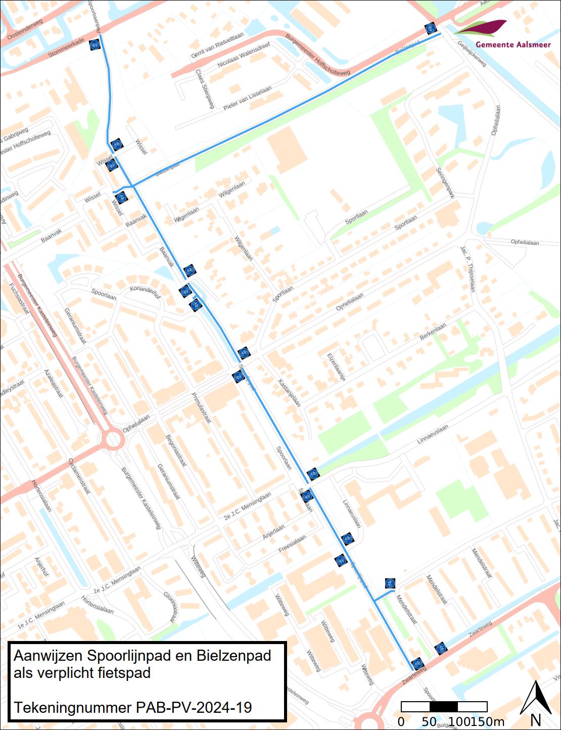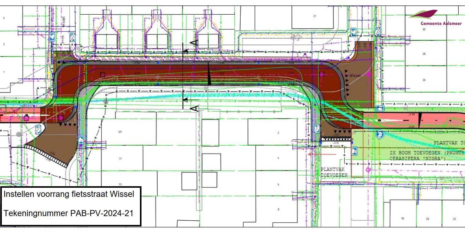 Burgemeester en wethouders van Aalsmeer besluiten tot het instellen van een voorrangsregeling in de straat Wissel en om het Spoorlijnpad en het Bielzenpad aan te wijzen als verplicht fietspad, zoals aangegeven op tekeningen PAB-PV-2024-19 en PAB-PV-2024-21.
