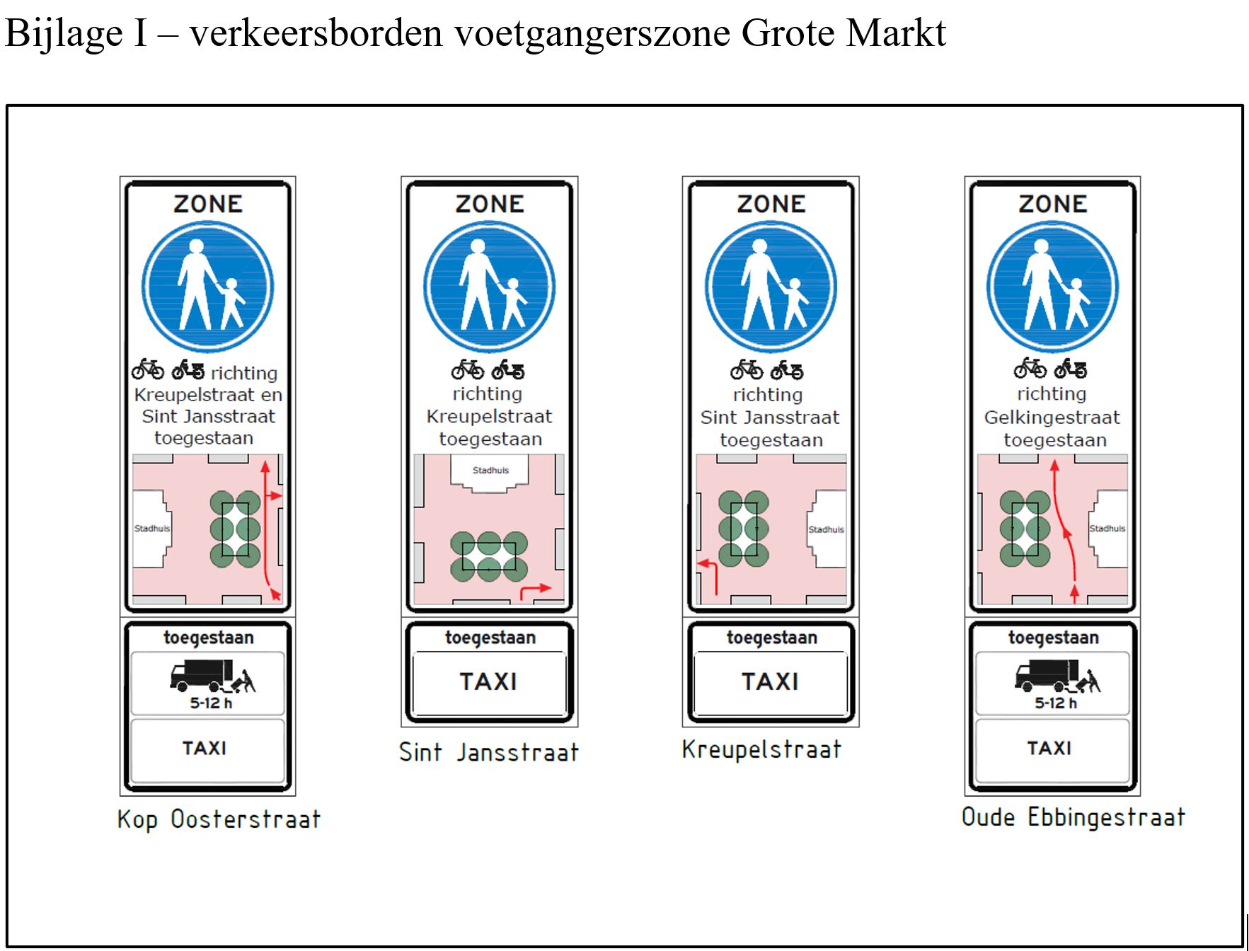 verwijderen van de verkeersborden C1 met de mogelijke combinaties van onderborden OB54 (uitgezonderd (brom)fietsers), “uitgezonderd laden en lossen tussen 05-12 h”, “uitgezonderd bus taxi en (brom)fiets” en “uitgezonderd fietsen van ma t/m zo tussen 21-09 h” in de Oosterstraat ter hoogte van nummer 1, in de Oosterstraat ter hoogte van nummer 35, in de Oosterstraat ter hoogte van nummer 54, op het Martinikerkhof ter hoogte van nummer 8, in de Gelkingestraat ter hoogte van de Grote Markt nummer 40, op Tussen Beide Markten ter hoogte van nummer 23, op Tussen Beide Markten ter hoogte van nummer 45, op Tussen Beide Markten ter hoogte van de Grote Markt nummer 51, op Tussen Beide Markten ter hoogte van de Vismarkt, in de Gelkingestraat ter hoogte van nummer 64 en in de Herestraat ter hoogte van nummer 1 conform bijlage 1 van het RVV 1990;