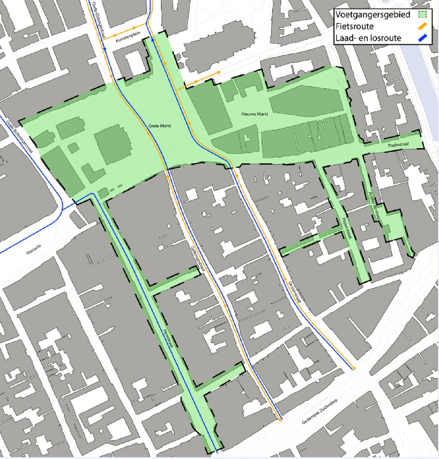 (Brom)fietsers en gemotoriseerd verkeer hebben niet de vrijheid om zich zoals de voetganger over de gehele Grote Markt te bewegen. Om de bereikbaarheid van de binnenstad voor de (brom)fietsers en de stadslogistiek te waarborgen wordt het voor deze verkeersdeelnemers toegestaan om twee routes over de Grote Markt te (blijven) gebruiken. De bestaande route vanuit de Oosterstraat in de richting van de Kreupelstraat blijft behouden in noordelijke rijrichting. Daarnaast komt er een nieuwe route die vanuit de Oude Ebbingestraat over de Grote Markt naar de Gelkingestraat loopt in zuidelijke rijrichting. Doormiddel van onderborden die toegevoegd worden aan het voetgangerszone-bord wordt het gebruik van deze routes over de Grote Markt toegestaan.