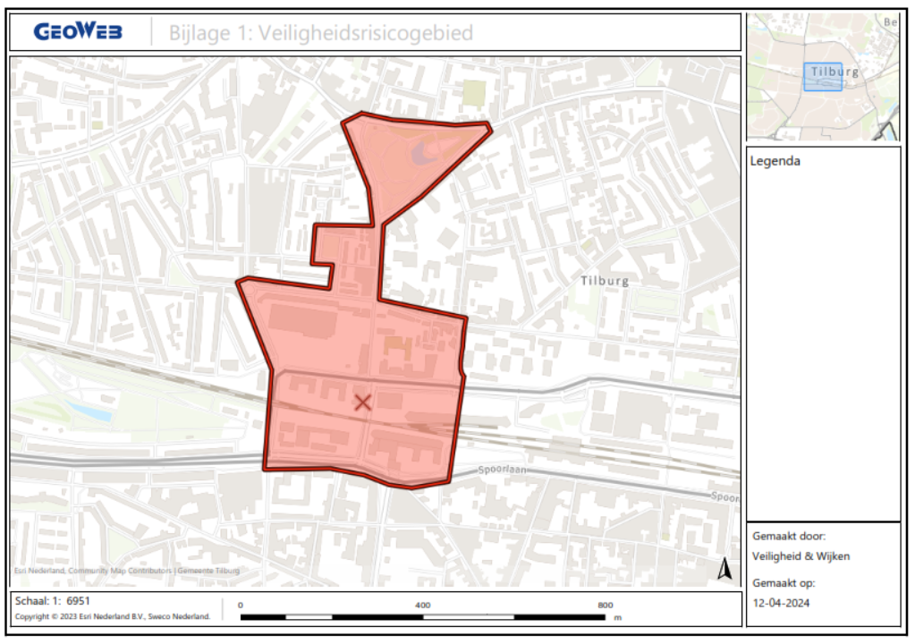 om als veiligheidsrisicogebied aan te wijzen voor een periode van 6 maanden het gebied, zoals geduid op de in bijlage 1 opgenomen plattegrond, althans dat deel van Tilburg dat wordt begrensd door en met inbegrip van (met de klok mee) Philips Vingboonsstraat, Dudokhof, Wilhelminapark, Gasthuisring, Lange Nieuwstraat, Fraterstraat, Burgemeester Brokxlaan, in rechte lijn over de spoorlijn naar kruising Spoorlaan/Utrechtsestraat, Spoorlaan, Hart van Brabantlaan, Talent Square, Sint Ceciliastraat, Jan Heijnsstraat en al het tussenliggende gebied.