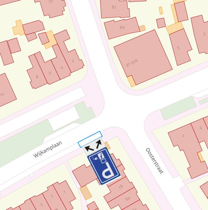Door middel van het plaatsen van verkeersbord E8c –“Parkeergelegenheid alleen bestemd voor het opladen van elektrische voertuigen”– van Bijlage 1 van het RVV-1990 met onderbord OB504 met twee pijlen schuin naar links- en rechtsonder, twee parkeerplaatsen op Wijkamplaan thv Oosterstraat 74, zoals aangeduid in het onderstaande situatieoverzicht, aan te wijzen als parkeergelegenheid alleen bestemd voor elektrische voertuigen met gebruik van de laadpaal.