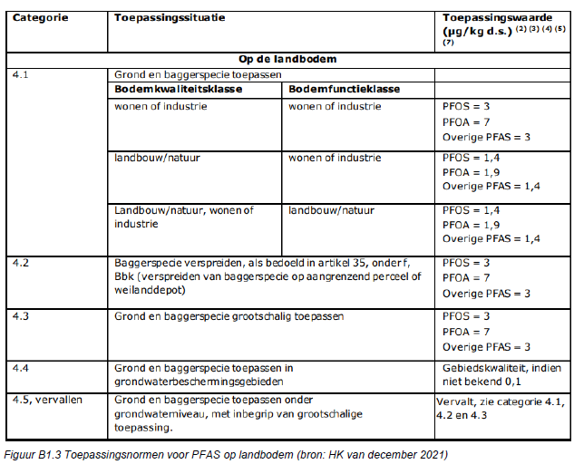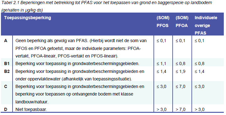 Het Handelingskader PFAS is door het Ministerie van I&W in het leven geroepen, om een kader te geven voor grondverzet van PFAS-houdende grond. De toetsing aan het Handelingskader PFAS is bedoeld voor de afvoer van grond naar en acceptatie door erkende verwerkers zoals grondbanken en grondreinigers. Tabel 2.1 bevat de toetsingswaarden en daarbij behorende toepassingsbeperkingen uit het Handelingskader PFAS van het Ministerie van Verkeer en Waterstaat (inclusief de aanpassingen van 13 december 2021).