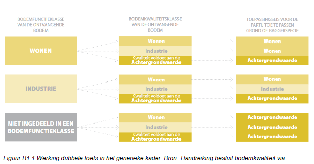 Bij deze zogeheten dubbele toets geldt dat de kwaliteitsklasse van de toe te passen partij grond of baggerspecie moet voldoen aan de strengste norm. Wanneer de ontvangende bodem niet in een bodemfunctieklassenkaart is opgenomen of wanneer de kwaliteit van de ontvangende bodem voldoet aan de Achtergrondwaarden, dan gelden de achtergrondwaarden als toepassingseis. Verdere informatie over het huidig wettelijk kader is opgenomen in bijlage 1.