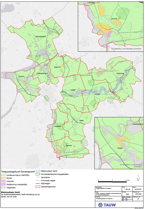 In deze nota zijn (net als voorheen) ook regels opgenomen voor toepassing van grond uit oevers en uiterwaarden van het winterbed van de Overijsselse Vecht. De waterschappen Vechtstromen en Drents Overijsselse Delta zijn hier beheerder en bevoegd gezag in het kader van het Besluit bodemkwaliteit. Indien het dagelijks bestuur van deze waterschappen de bodemkwaliteitskaart van IJsselland vaststelt dan kan deze ook als bewijsmiddel dienen bij toepassing op locaties die in beheer zijn bij de waterschappen. De bodemkwaliteitskaart hoeft niet in de waterschapsverordening te komen en blijft als losstaand beleidsdocument bestaan.