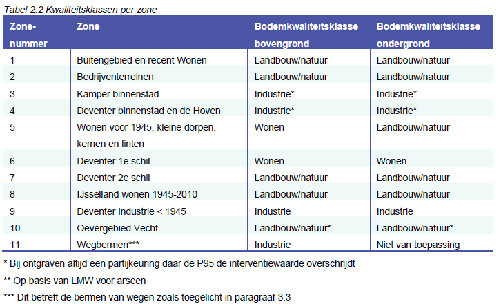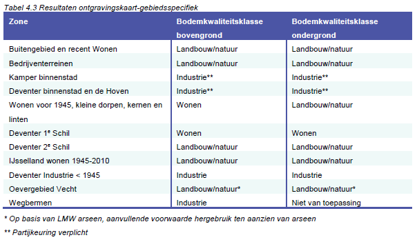 In de onderstaande tabel is de klasse aangegeven die volgens het gebiedsspecifieke beleid aan de verschillende zones en bodemlagen zijn toegekend. Deze informatie is ook gepresenteerd op de kaart in bijlage 4.