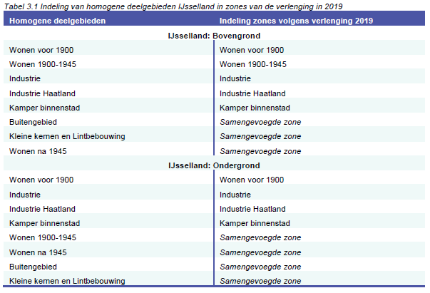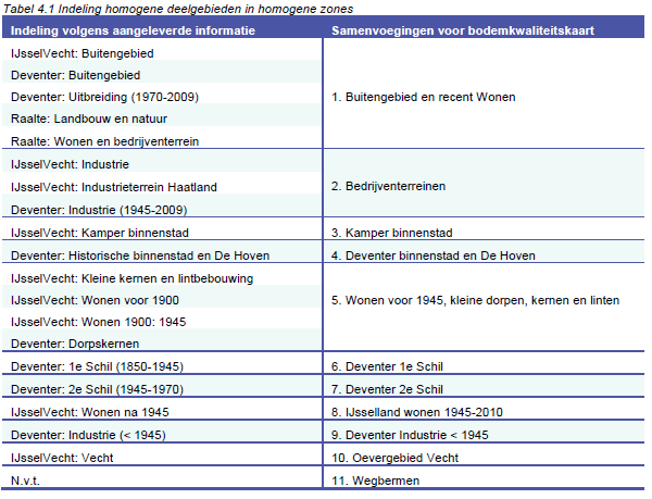 Op basis van de bevindingen in het vooronderzoek en voorgaande statistische analyse zijn sommige deelgebieden samengevoegd. Een overzicht van de (samengevoegde) deelgebieden in zones is weergegeven in tabel 4.1.