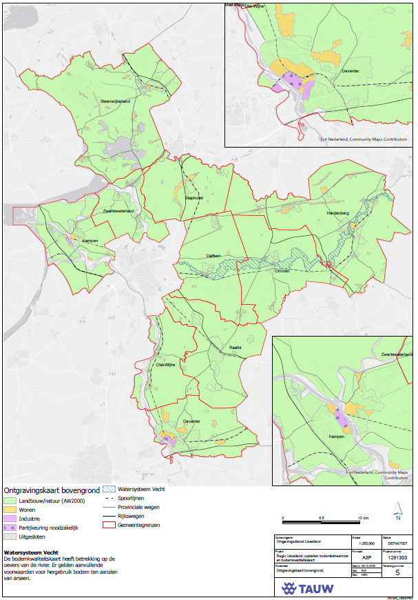 De natte waterbodem (permanent onder water) en de oevers/uiterwaarden van de IJssel en het Zwarte Water (beheerder Rijkswaterstaat) zijn uitgesloten van de bodemkwaliteitskaart en daarmee ook van deze Nota bodembeheer. Langs de IJssel en het Zwarte Water zijn een aantal drogere oevergebieden aangewezen. Dit zijn buitendijkse gebieden die geen of een zeer geringe overstromingsfrequentie kennen. De drogere oevergebieden worden door het Besluit bodemkwaliteit beschouwd als zijnde landbodem en vallen onder beheer van de betreffende gemeente. Ze zijn daarom ook als zodanig opgenomen in de bodemkwaliteitskaart en Nota bodembeheer.