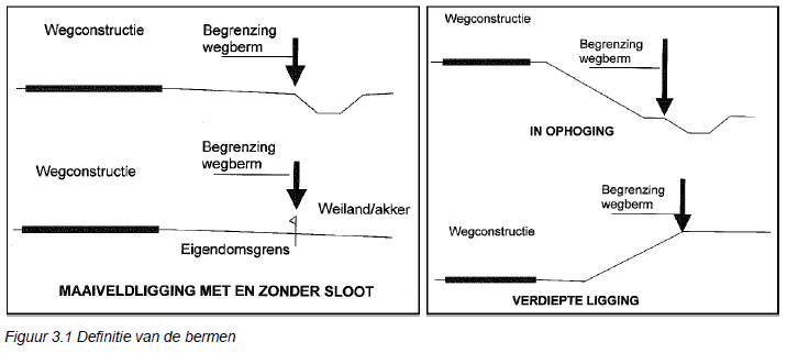 Voor de definitie van berm wordt gebruik gemaakt van de definitie gegeven in het Besluit bodemkwaliteit (artikel 63, lid 3). Hierin staat dat een berm maximaal 10 meter uit de weg ligt, tenzij de berm eerder wordt begrensd door een fysieke afscheiding. Deze definitie is ook te zien in onderstaand figuur.