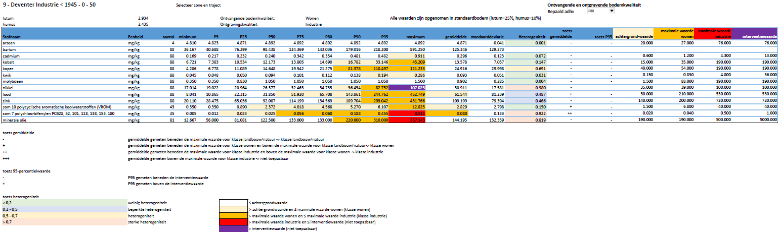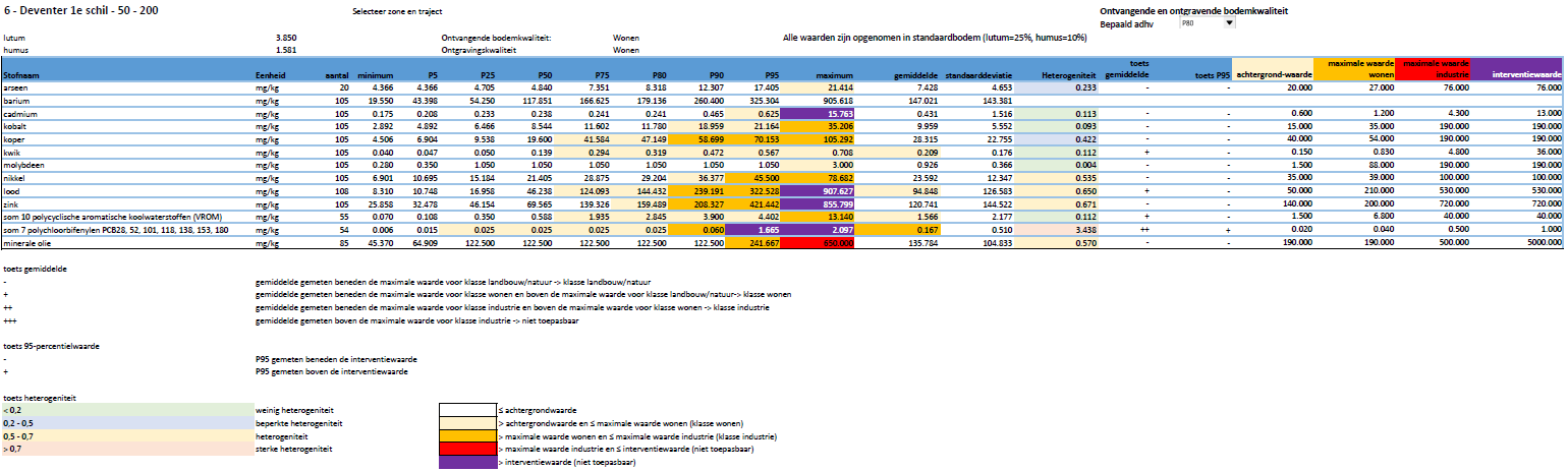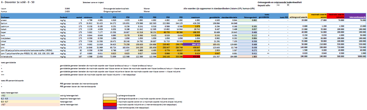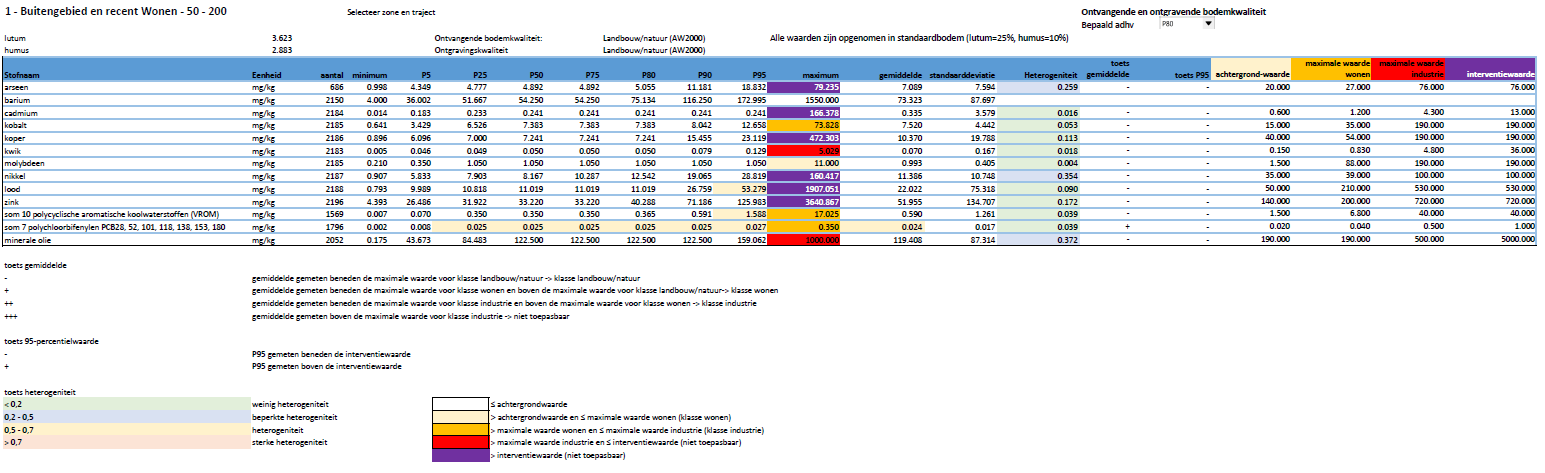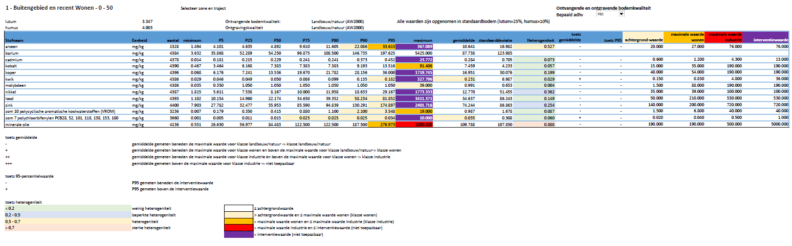 Voor het betreffende gebied is er in enige mate heterogeniteit aangetoond. Hierbij overschrijden zowel in de boven- als ondergrond koper, kwik, lood, zink, PCB en PAK de achtergrondwaarden. Voor de betreffende zone zijn uitbijters van koper en lood verwijderd die zijn vastgesteld op reeds gesaneerde locaties. Na verwijdering van de betreffende uitbijters valt de bodemkwaliteit van zowel de boven- en ondergrond in de klasse Wonen. Hiermee is de bodemkwaliteit voor de bovengrond verbeterd ten opzichte van de verlenging in 2019, waarbij de bovengrond als industrie was geclassificeerd.