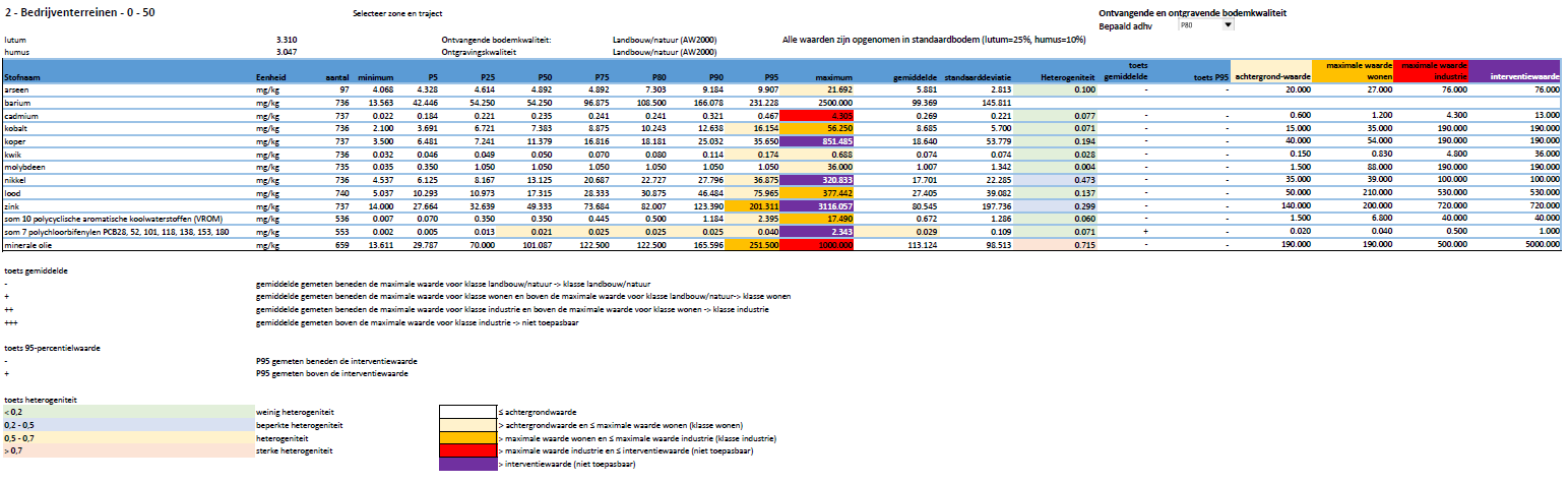 De dataset laat eenzelfde beeld zien (weinig heterogeen) ten opzichte van de reeds vastgestelde bodemkwaliteit uit de verlenging van 2019. De classificatie op basis van de P80 voor zowel boven- als ondergrond is Landbouw/Natuur. Het deelgebied kan worden samengevoegd in de zone Bedrijventerreinen (2).