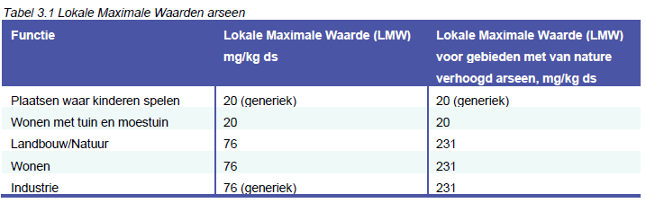 In de vorige Nota is onderbouwd waarom van nature voorkomend arseen geen belemmering vormde voor hergebruik binnen de regio. Er gold een maximale waarde (LMW) voor alle functies met uitzondering van bodemgevoelig gebruik zoals kinderspeelplaatsen en wonen met tuin. Deze LMW bedroeg 432 mg/kg ds.