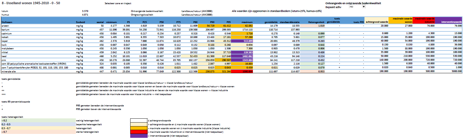 De dataset laat eenzelfde beeld zien ten opzichte van de reeds vastgestelde bodemkwaliteit uit de verlenging van 2019. De classificatie op basis van de P80 voor zowel boven- als ondergrond is Landbouw/Natuur. Het betreffende deelgebied is echter niet opgenomen in de zone Buitengebied en recent Wonen (1) aangezien er duidelijk meer heterogeniteit is waargenomen ten opzichte van andere deelgebieden in die zone. Het deelgebied wordt daarmee zone IJsselland Wonen na 1945 (8).