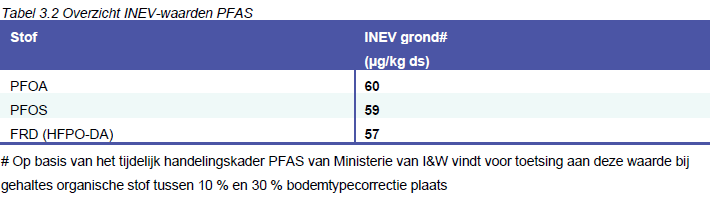 Het RIVM heeft op 5 maart 2020 voorlopige interventiewaarden voor PFAS-verbindingen gerapporteerd; zogeheten INEV’s (Indicatieve Niveaus voor Ernstige Verontreiniging).4 Op 20 juli 2021 heeft het RIVM de risicogrenswaarden aangepast5 , welke vanaf 2 mei 2022 de INEV-waarden uit 2020 hebben vervangen6 . Als de INEV-waarde wordt overschreden, is dit een indicatie voor een ernstige verontreiniging. De INEV-waarden van PFOS, PFOA en GenX zijn weergegeven in tabel 3.2. Het bevoegd gezag Wet bodembescherming kan de INEV-waarde eventueel gebruiken voor de beoordeling of sprake is van een geval van ernstige bodemverontreiniging met PFAS.