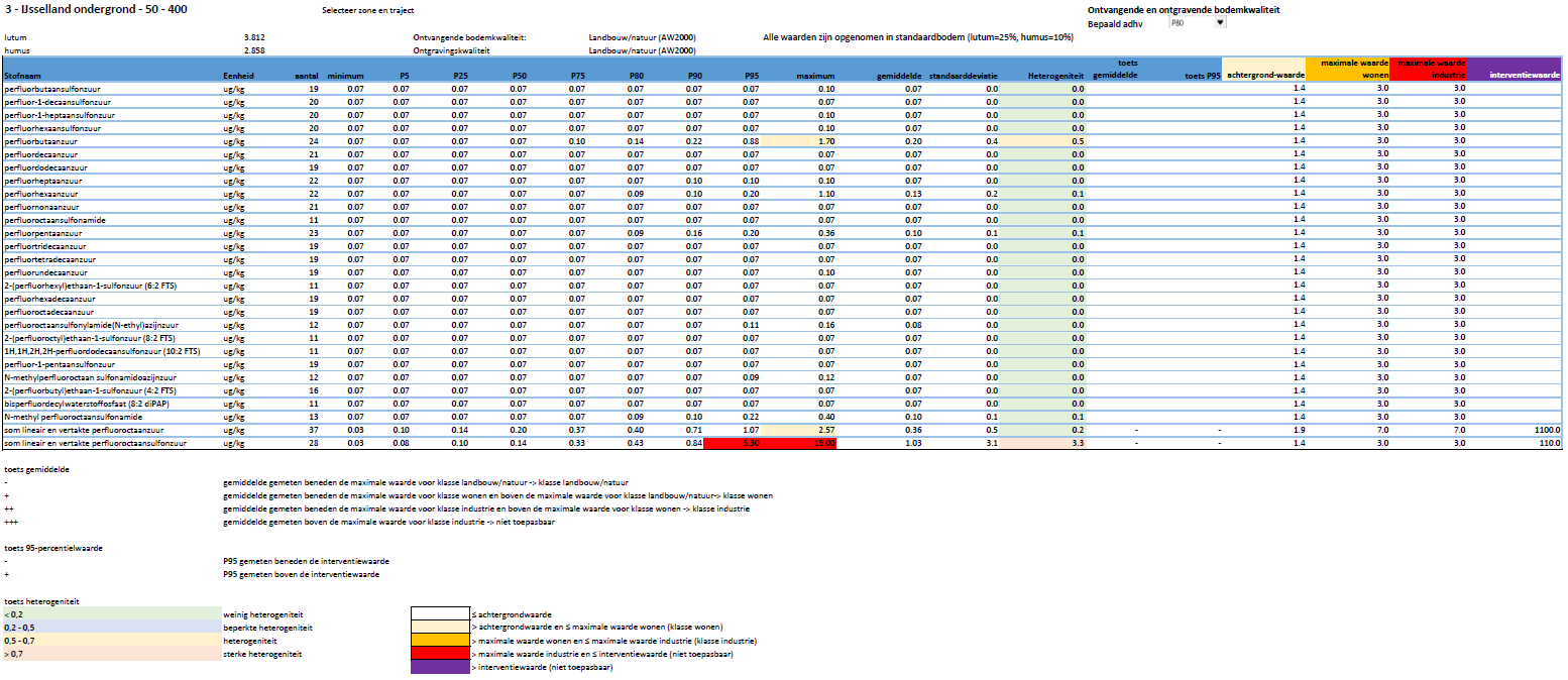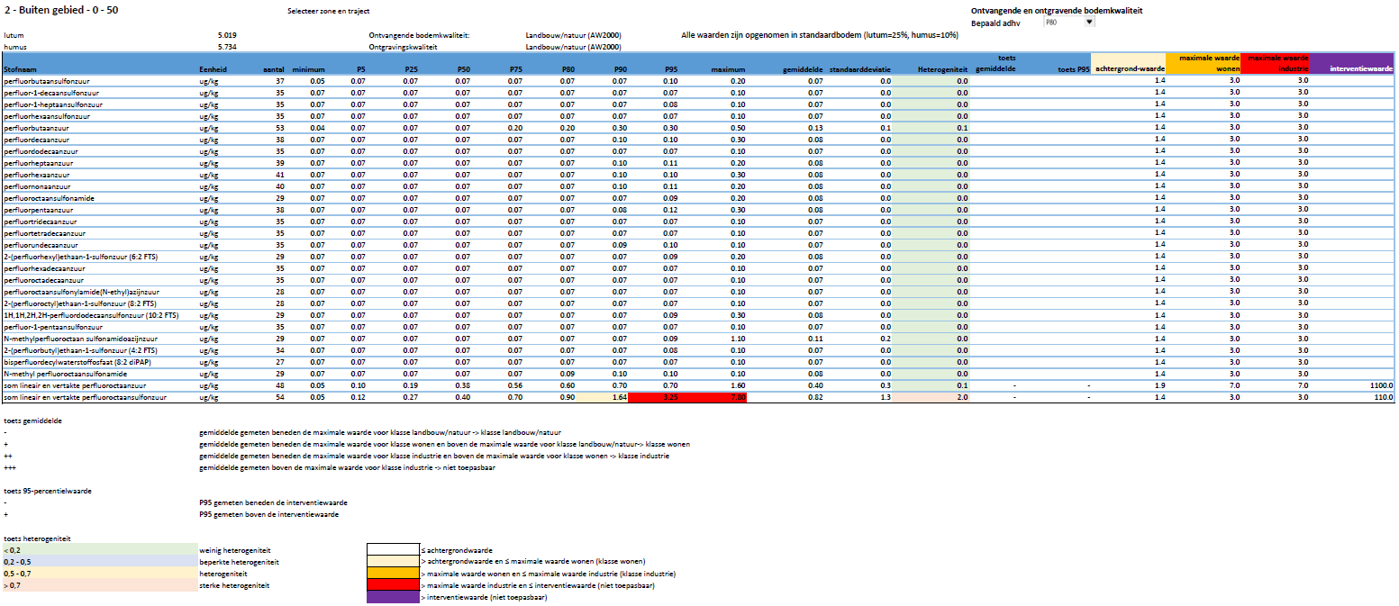 Uit de gegevens van het BIS bestand (2019-2023) blijkt dat in de bovengrond van het bebouwd gebied, de bovengrond van het buitengebied en de ondergrond van de regio, PFAS relatief homogeen en diffuus voorkomt met gehalten beneden de achtergrondwaarden (Handelingskader PFAS, december 2021). Uitzondering hierop zijn de som lineair en vertakte PFOS-waardes. Echter zijn voor PFAS geen uitbijters verwijderd, derhalve wordt verwacht dat de daadwerkelijke heterogeniteit een stuk lager is dan gerapporteerd in de percentielbladen (bijlage 6). Ook is te zien in de percentielbladen dat de PFOS-gehaltes ‘snel teruglopen’. Zo zijn er geen P90-waarden boven de maximale waarde voor wonen/industrie en geen P80-waarden boven de achtergrondwaarden.