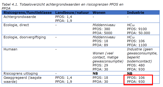 Opgemerkt wordt dat voor de functie Wonen uitgegaan dient te worden van weinig bodemcontact en geen gewasconsumptie7 . Ook dient er (bij toepassing van deze grond) een ‘combitox’ te worden uitgevoerd voor PFAS anders dan alleen PFOS en PFOA. Hierbij worden de gehalten van de overige PFAS omgerekend naar een theoretisch gehalte PFOA. Alleen het gemeten gehalte PFOS en PFOA toetsen volstaat dus niet. Dit is een complexe toetsing die per toepassing dient te worden uitgevoerd door een specialist.