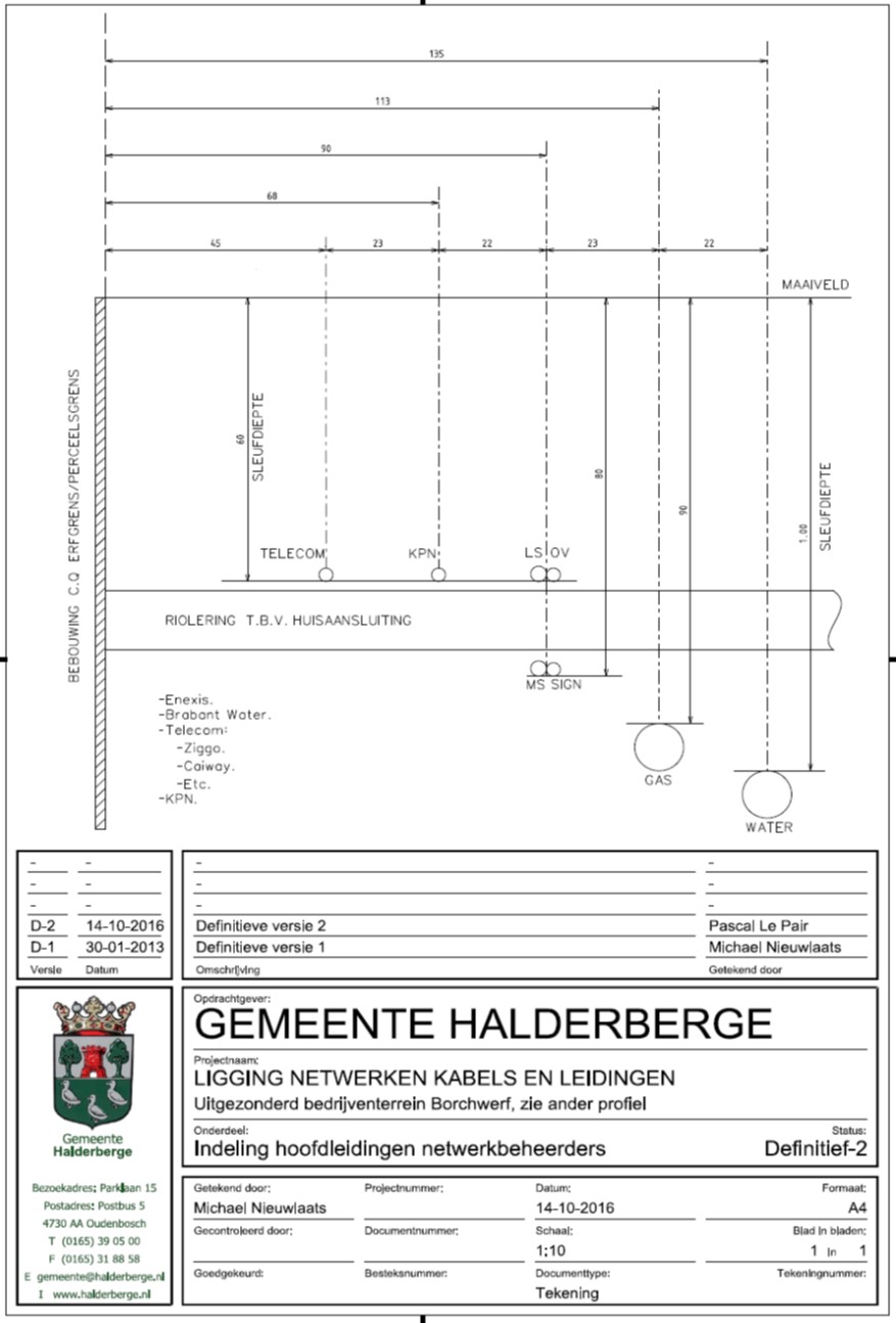 revisietekening: een gewaarmerkte tekening die van kabels of leidingen die aangelegd zijn, de werkelijke ligging ten tijde van de aanleg aangeeft in X-, Y- en waar van toepassing Z- coördinaten volgens het Rijksdriehoek (RD-) stelsel alsmede hoeveel kabels of leidingen aanwezig zijn in een sleuf(deel);