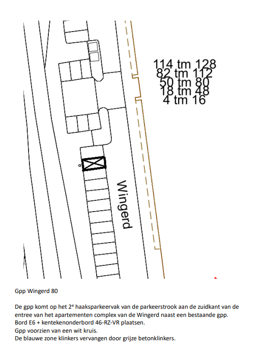 dat het aanwijzen van een gehandicaptenparkeerplaats het beste kan geschieden ter hoogte van de Wingerd 80, volgens de bijgevoegde situatieschets;