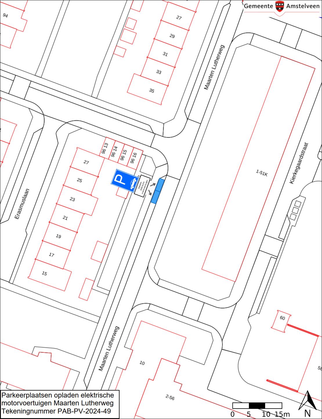 Burgemeester en wethouders van Amstelveen besluiten om in de straat Maarten Lutherweg twee parkeerplaatsen aan te wijzen als parkeerplaats voor het opladen van elektrische motorvoertuigen. De parkeerplaatsen mogen alleen gebruikt worden voor het opladen van deze elektrische motorvoertuigen.