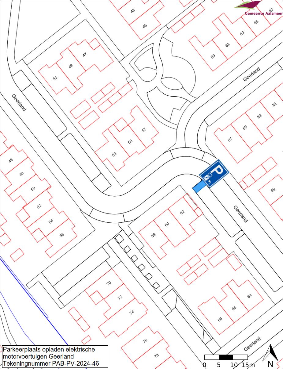Burgemeester en wethouders van Aalsmeer besluiten om in de straat Geerland één parkeerplaatsen aan te wijzen als parkeerplaats voor het opladen van elektrische motorvoertuigen. De parkeerplaats mag alleen gebruikt worden voor het opladen van deze elektrische motorvoertuigen.