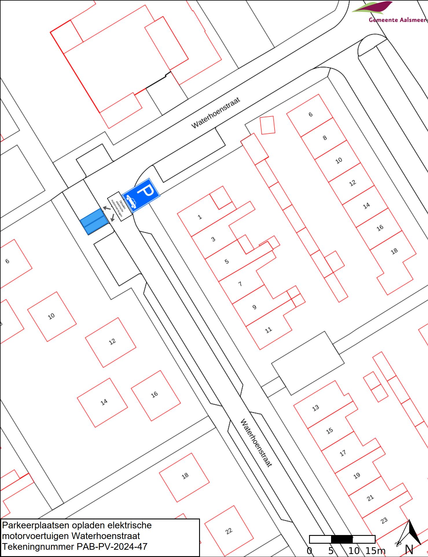 Burgemeester en wethouders van Aalsmeer besluiten om in de Waterhoenstraat twee parkeerplaatsen aan te wijzen als parkeerplaats voor het opladen van elektrische motorvoertuigen. De parkeerplaatsen mogen alleen gebruikt worden voor het opladen van deze elektrische motorvoertuigen.