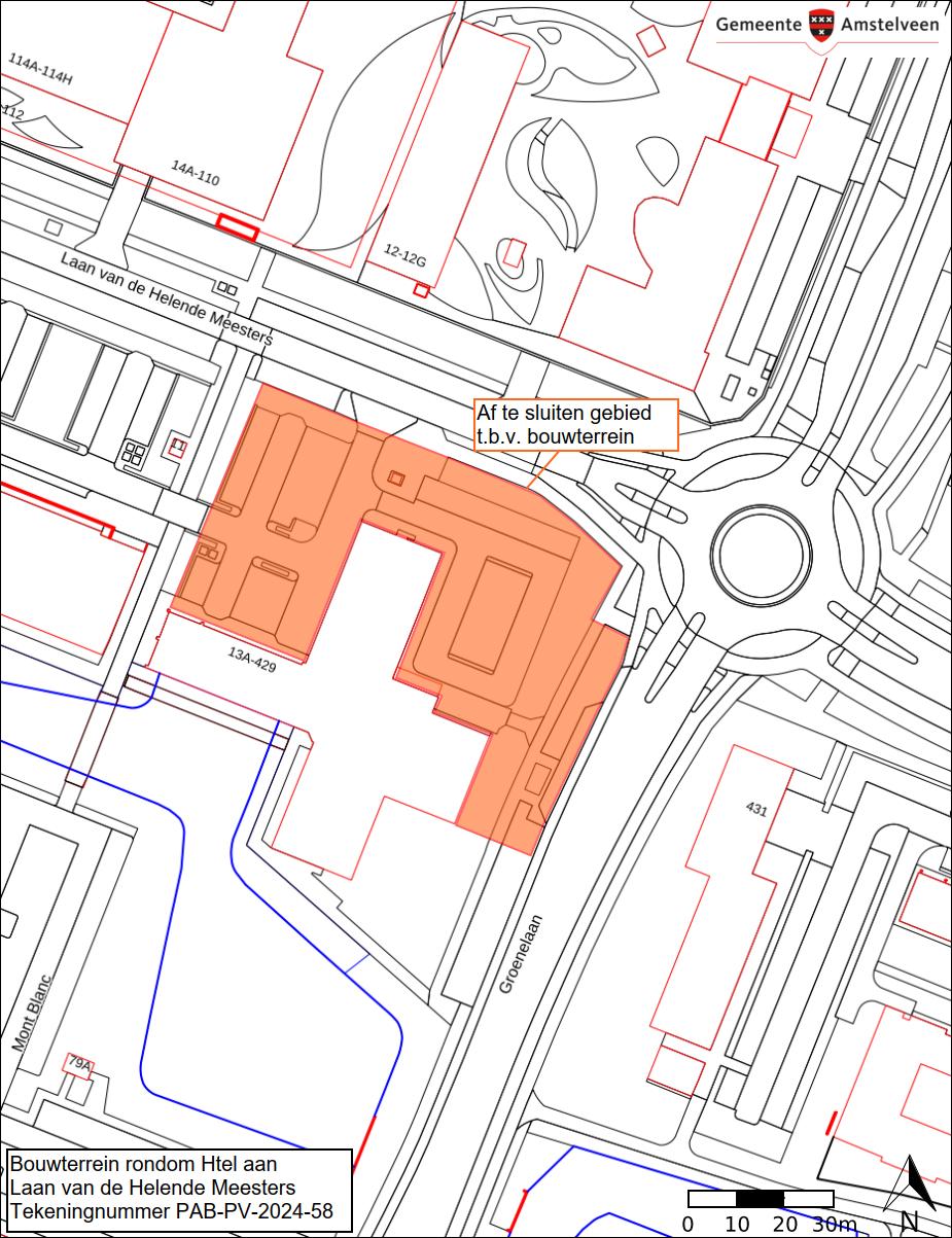 Burgemeester en wethouders van Amstelveen besluiten om een parkeerterrein aan de Laan van de Helende Meesters voor de periode van april 2024 tot en met maart 2025 af te sluiten voor verkeer, zoals aangegeven op tekening PAB-PV-2024-58.
