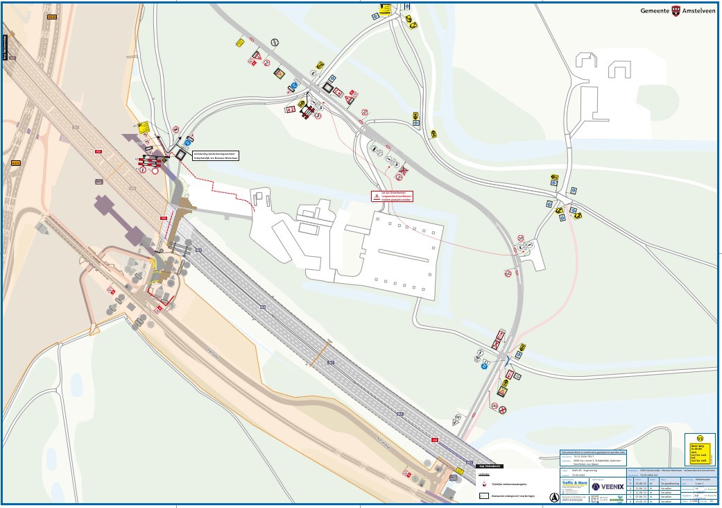 Dit gebeurt door het (ver)plaatsen, aanbrengen en verwijderen van borden A130, A230, C1, C6, C14, C16, G7 (zone), G11 en G12A van bijlage 1 van het Reglement verkeersregels en verkeerstekens 1990 (RVV 1990), deels met onderbord, zoals aangegeven op tekening 74.20.3204.321 van Veenix.