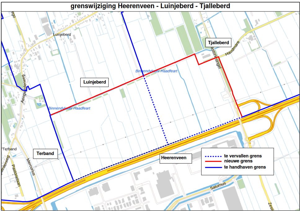 In de BAG de dorpsgrens tussen Heerenveen en Luinjeberd en Tjalleberd wijzigen, zodat Klaverblad Noordoost binnen de dorpsgrenzen van Heerenveen ligt.