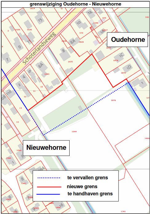 In de BAG de dorpsgrens tussen Oudehorne en Nieuwehorne wijzigen, zodat de nieuwbouw in fase 2 van de Fjilden in Nieuwehorne ligt.