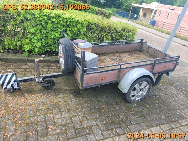 In Kruidenwijk op de Fluitekruidstraat ter hoogte van perceel 67 te Almere staat een aanhangwagen gestald. Kenmerk van de aanhanger: De aanhanger is zwart van kleur (frame) met houten borden aan de zijkant en stalen spartborden.